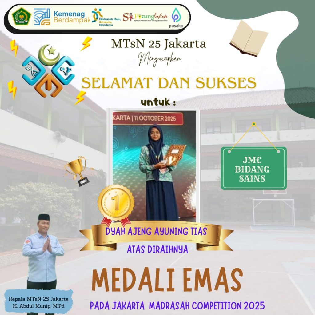 Jakarta – Diah Ajeng, siswi MTs Negeri 25 Jakarta meraih Medali Emas dalam Kejuaraan Jakarta Madrasah Competition 2025 bidang IPA.